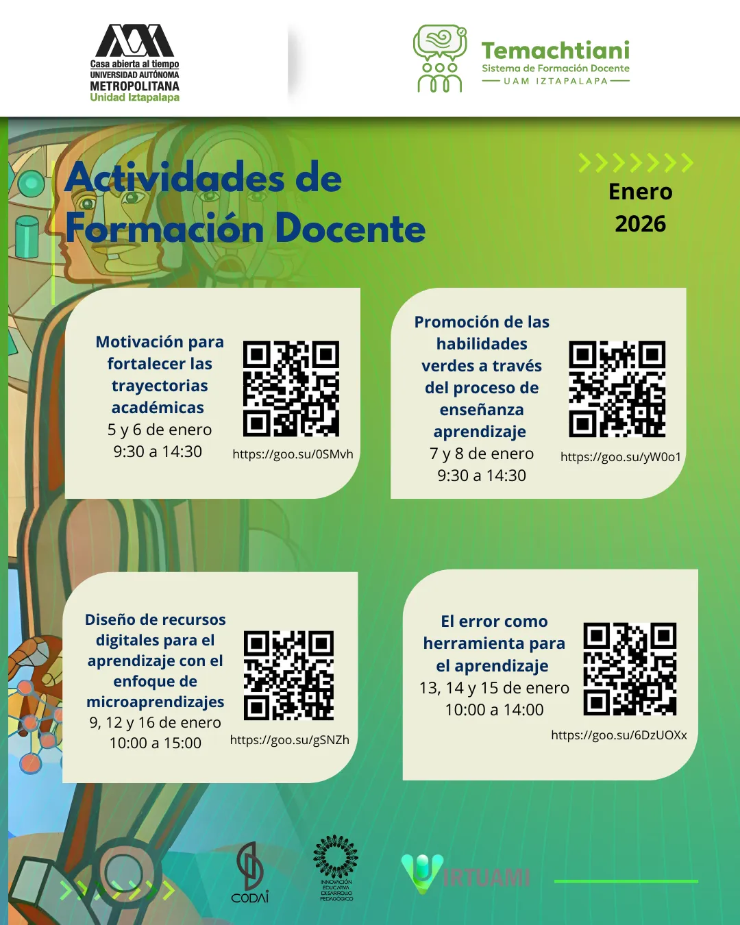 Si eres profesora o profesor de la UAM Iztapalapa, este es el momento perfecto para iniciar el año fortaleciendo tu práctica docente con cursos breves, útiles y diseñados para ti.