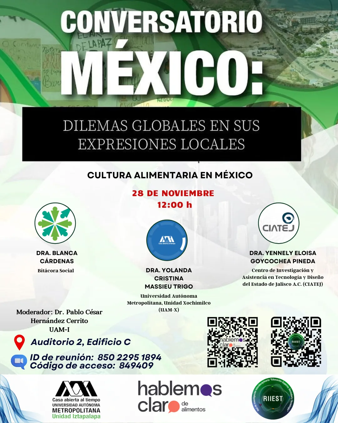 En esta edición participarán como panelistas la Dra. Blanca Cárdenas, de Bitácora Social; la Dra. Yolanda Cristina Massieu Trigo, de la Universidad Autónoma Metropolitana, Unidad Xochimilco (UAM-X); y la Dra. Yennely Eloisa Goycochea Pineda, del Centro de Investigación y Asistencia en Tecnología y Diseño del Estado de Jalisco A.C. (CIATEJ). Todas ellas compartirán sus perspectivas en torno a la alimentación, la identidad y la sostenibilidad. La moderación estará a cargo del Dr. Pablo César Hernández Cerrito (Universidad Autónoma Metropolitana, Unidad Iztapalapa).