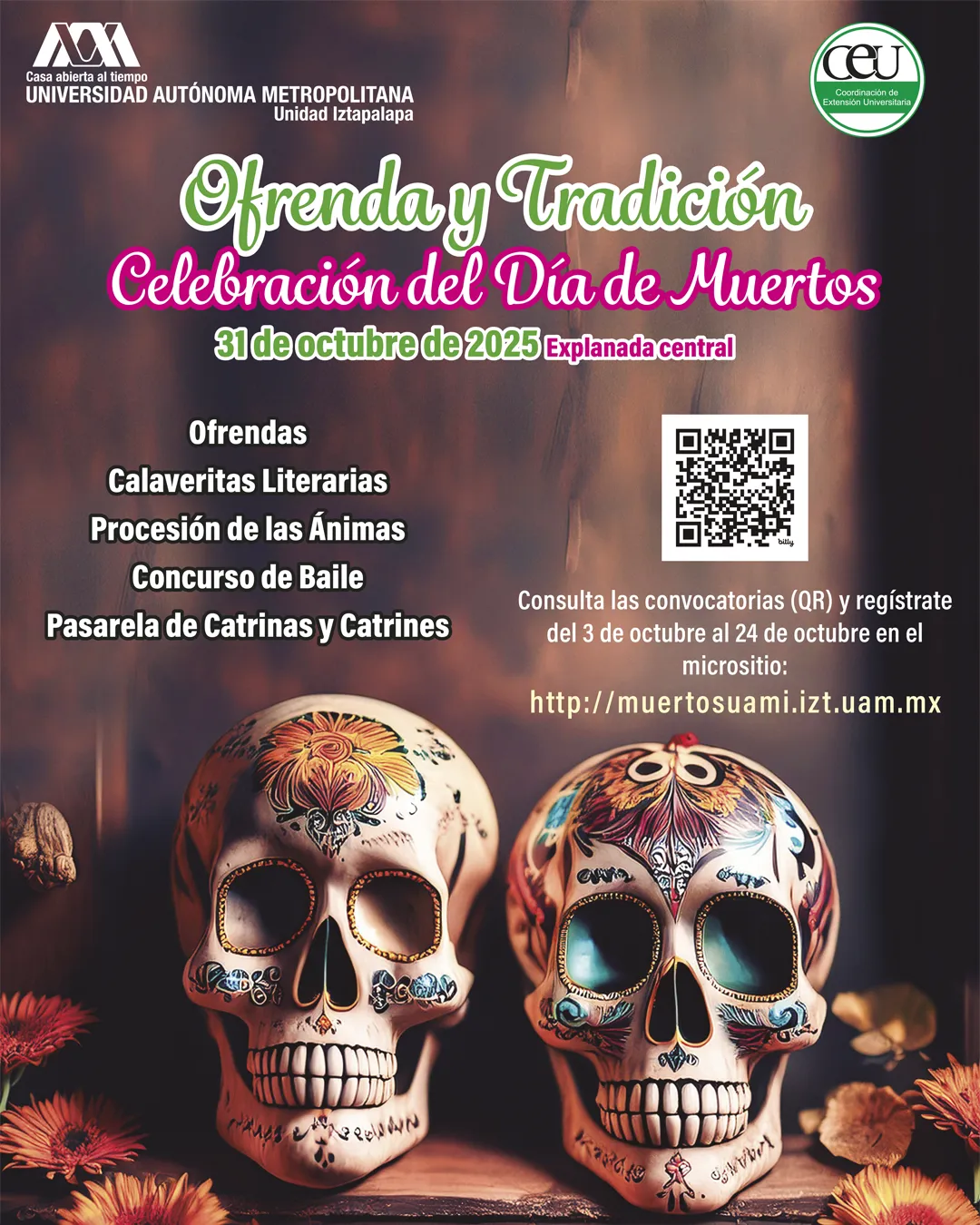 La Universidad Autónoma Metropolitana, Unidad Iztapalapa, a través de la Coordinación de Extensión Universitaria – Secciones de Actividades Culturales y Difusión–, invita a la comunidad a participar en la gran celebración del Día de Muertos 2025.