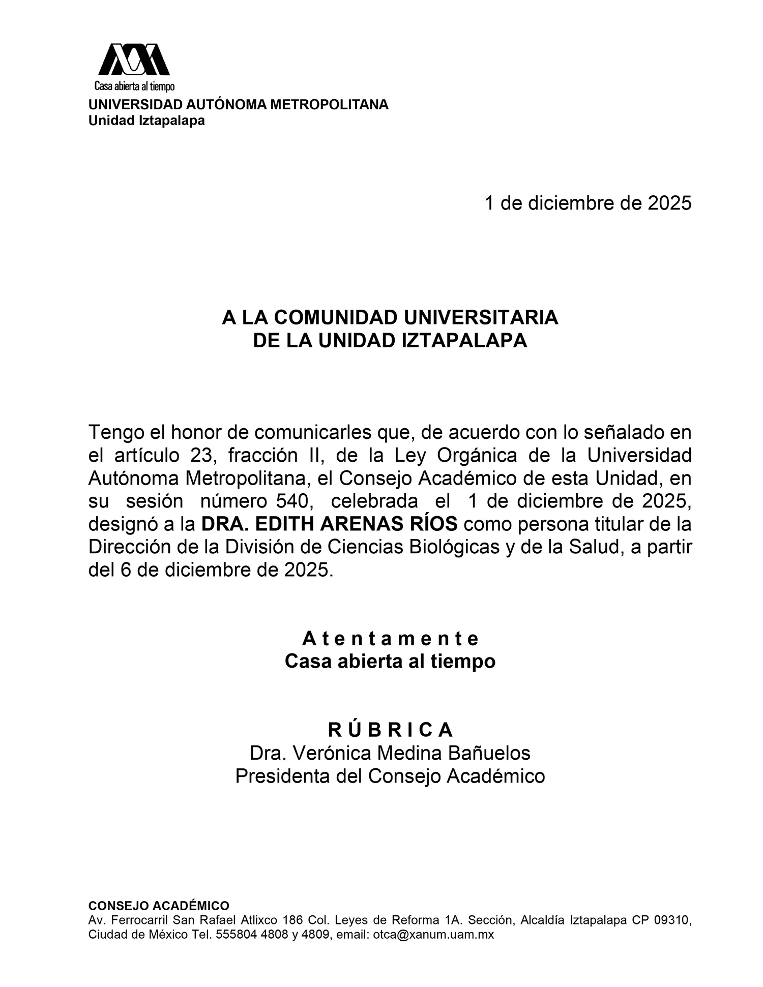 Dra. Edith Arenas Ríos Directora de la División de Ciencias Biológicas y de la Salud (CBS) para el periodo 2025-2029 Volver a Inicio